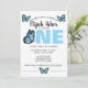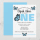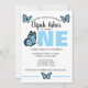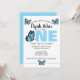 Celebre o primeiro marco do seu pequeno borboleta com este encantador convite de primeiro aniversário de borboleta azul. Com borboletas em tons azuis suaves e a doce frase “Nosso Primeiro Ano Voou”, este design é perfeito para a celebração do primeiro aniversário de um menino.