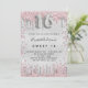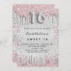 Um convite moderno, na moda e glamouroso para uma festa de aniversário Doce 16, 16. Um fundo de aspecto fino prateado, decorado com pó brilhante de prata rosa e falso. Personalize e adicione o seu nome e detalhes da festa. O número 16 é escrito com uma fonte de estilo de balão, script.