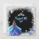 Adorável e elegante convite com a fenda da relva prateada, borboletas bonito, coroa, corações brancos e menina vestindo um lindo e brilhante vestido azul e rosa. Seus calçados são cor-de-rosa e azuis brilham alto salto. Linda coroa princesa prateada e Doce Dezesseis em uma letra elegante.