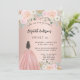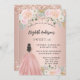 Um convite moderno, na moda e glamouroso para uma doce festa de aniversário 16, 16. Um fundo rosa de ouro com flores cor-de-rosa pinceladas, uma garota vestindo um vestido de bola. O nome é escrito com um moderno estilo escrito à mão. Personalize e adicione os detalhes da sua festa.