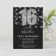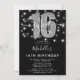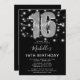 Aniversário 16 anos! Convide amigos e família para comemorar o 16.º aniversário com este moderno 16.º convite. Design apresenta um fundo preto, os números 16 em falso cintilação prateada, luzes mágicas de fadas de cordas, um roteiro elegante de caligrafia, um modelo de aniversário moderno que é fácil de personalizar e a opção de adicionar uma fotografia ao contrário.