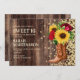 Doce 16 convites de aniversário com botas de cowboy rústicas, girassóis amarelos brilhantes e belas rosas vermelhas sobre um fundo castanho escuro.