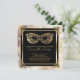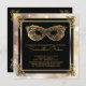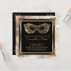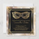 Convites de festas de aniversários de mascarada de inverno, doces 16 pretos e de ouro, preto e dourado - Percursos metálicos em ouro, chic, escrolls decoram os cantos contra um fundo preto com uma estrutura quadrada de aparência de metal dourado e luzes de boque com borda espalhada de flocos de neve. Uma cor de ouro metálico, design de máscara de mascarada, enfeite o topo. Lê 'Por favor, junte-se à Mascarada Ball Honoring' em letras douradas com o nome personalizado abaixo, em letras elegantes, douradas, com script de cor. Detalhes personalizados de dezesseis participantes, abaixo, em caracteres dourados, incluindo informações de RSVP. As cores e estilos do texto podem ser alterados para se adequarem a você. A parte de trás tem pergaminhos de ouro nos cantos contra um fundo preto sólido. Bonitos convites para o tema preto e ouro 16ª festas de aniversário, festas de mascarada no inverno Sweet 16, festas no feriado Sweet 16, bem como o Excelente Gatsby ou temas de glama de Hollywood.