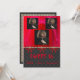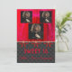 A placa frontal tem uma seda vermelha vívida caindo como uma cortina e um véu rosa sobre ela. A segunda metade é um simples padrão tecido preto. Na seda vermelha, há 3 fotografias. Entre os padrões preto e vermelho, há uma linha de pérolas brancas creme decoradas com três brochuras de arco de fita de cetim vermelho. Cada broche tem pérolas brancas creme e diamantes amarelos. A parte de trás do cartão tem duas cordas de pérolas, que é uma moldura para um fundo avermelhado onde o texto é escrito a preto. Por trás da armação de pérolas, há o mesmo padrão tecido preto.