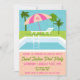 Um convite de aniversário para uma doce festa de 16 piscinas. Apresentando um gráfico de uma piscina de natação, mais solto, guarda-chuva solar com o número 16 e palmeiras. Um convite moderno com vibrações tropicais de verão que pode ser facilmente personalizado.