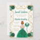 Este doce 16 convite apresenta uma elegante estrutura de ouro, uma bela princesa de cabelo vermelho e um vestido verde, flores e um balão. Isto é perfeito para uma doce festa de aniversário de dezesseis.