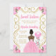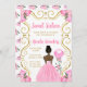 Este doce 16 convite apresenta uma elegante estrutura de ouro, uma bela princesa com pele escura e um vestido rosa, flores e um balão. Isto é perfeito para uma doce festa de aniversário de dezesseis.