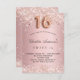 Para uma elegante festa de aniversário 16, 16. Um plano de fundo de gradiente cor-de-rosa. Decorado com rosa dourado falso brilho. Personalize e adicione um nome e detalhes da parte. O nome é escrito com um script de estilo manuscrito. O número 16 é escrito com uma fonte no estilo do balão.