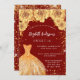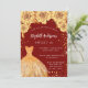Um convite moderno, na moda e glamouroso para uma doce festa de aniversário 16, 16. Um fundo vermelho com poeira falsa dourada, um vestido e ouros, flores. O nome é escrito com um moderno estilo escrito à mão. Personalize e adicione os detalhes da sua festa.
