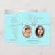 Convite de Quinceanera azul prata e turquesa com foto de bebê e atual. Este doce convite de Quinceanera azul prata e turquesa apresenta fita e laço prateados elegantes com molduras ovais prateadas para duas fotos - uma de bebê e a outra atual. Personalize este convite de Quinceanera azul prata e turquesa escolhendo o botão "Personalize!" para começar a adicionar suas fotos, detalhes do evento, estilo de fonte, tamanho e cor da fonte e texto. Por favor, note que todos os desenhos de cartões e convites que você encontrará na Zazzle são gráficos impressos sem joias, laços, relevos, rebaixados ou peças adicionais.