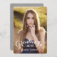 Cartão com fotos perfeito que convida seus família e amigos à festa de formatura da sua filha. Roteiro doce | 2015 convites da festa de formatura. Design pelo © de Elke Clarke para MonogramGallery. Adicione seus próprios foto e texto. Uma folha de prova branca retro elegante do texto da pia batismal do roteiro com o formando das palavras "2015" é imprimida na parte dianteira com um leve efeito cinzento do ombre. Adicione seu texto do convite na parte de trás do cartão com uma pia batismal branca moderna no fundo cinzento ou cinzento da luz do vintage da (efeito impresso da foto) - do papel de embalagem. Outros estilos e cores disponíveis.