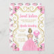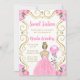 Este doce 16 convite apresenta uma elegante estrutura de ouro, uma bela princesa com cabelo louro e um vestido rosa, flores e um balão. Isto é perfeito para uma doce festa de aniversário de dezesseis.