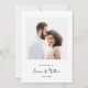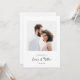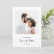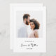 Este convite de casamento simples e na moda, preto e branco apresenta tipografia de scripts visuais e caprichosos, juntamente com a sua fotografia pessoal favorita. Um olhar elegante e clássico minimalista que ainda é único e contemporâneo.
