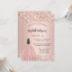 Um convite moderno, na moda e glamouroso para uma doce festa de aniversário 16, 16. Um fundo rosa de ouro com poeira falsa de ouro, uma garota vestindo um vestido de bola. O nome é escrito com um moderno estilo escrito à mão. Personalize e adicione os detalhes da sua festa.