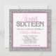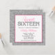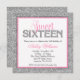 Um convite de aniversário moderno do doce dezesseis. Caracterizando um brilho da prata do falso projete com acentos da luz - rosa e preto. O design é gráficos impressos plano - BRILHO NAO REAL.