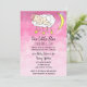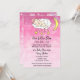 Uma linda bebê branca dormindo sobre uma nuvem rodeada de corações e estrelas, convites de chá de bebê com fundo rosa.