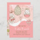 Bonito Páscoa Brunch convite em cor-de-rosa pastel, branco e castanho-claro. Páscoa com corações pendurados e ovos de ornamentado. Os ovos têm decorações florais e de espiral. Uma carta doce e elegante perfeita para qualquer celebração de Primavera ou Páscoa. Todo o texto é personalizável por você. A correspondência da placa com as informações de RSVP.