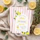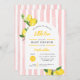 Celebre a mais doce com este convite de chá de fraldas de querido! Apresentando um tema alegre de limão de verão com limões de aquarela moles moldando uma forma arquitetada, esta design inclui a tipografia moderna e um fundo de listras de cabana de rosa claro aquática para a perfeita mistura de doce e estilo. Disponível como cartões impressos profissionalmente ou um download digital conveniente, é uma maneira nova e encantadora de convidar convidados para chá seu pequeno limão com amor.