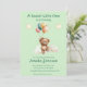 Um ursinho bonitinho pendurado em um punhado de balões coloridos voa pelas nuvens com um casal de estrelas sobre o anúncio "Um Pequeno Doce está a caminho." Todo texto pode ser facilmente alterado para suas informações.