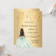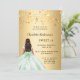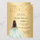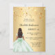 Um fundo com aspecto de ouro. Decorada com estrelas ouros e uma garota vestindo um vestido verde. Personalize e adicione um nome e detalhes.