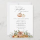 Convite para chá de fraldas temático da abóbora. Design apresenta uma abóbora com flores rústicas e folhagem. Personalize com suas informações ou clique em "Clique para personalizar mais" para editar estilos de fonte, tamanho e cores.
