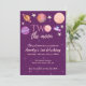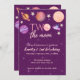 "Até a Lua e além! Celebre o segundo aniversário da sua filha com o nosso convite de festa temático espacial encantador. Imagine um céu celestial em tons hipnotizantes de rosa e roxo, completo com a Lua, planetas e um foguete adorável voando em direção às estrelas. Torne-o uma experiência cósmica personalizada adicionando seus próprios detalhes e prepare-se para uma celebração inesquecível!"