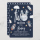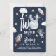 Super fofo Woodland Animal Space temático convite ao segundo aniversário. A design apresenta o título 'DOIS da Lua', que incorpora uma lua, decorada com animais adoráveis da floresta como astronautas, foguetes, estrelas e nuvens. O modelo de tendência é uma combinação de um elegante script escrito à mão e fontes brancas serif. Todo texto é fácil de personalizar usando o modelo fornecido.
