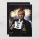 Donald Trump toca no Ano Novo com um chapéu festivo, um copo de champanhe e um cartaz ousado de "Feliz ano novo". Os fogos de artifício vibrantes no fundo amplificam o humor comemorativo.