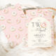 Convite de festa de 2º aniversário Donuts Rosa. Convite dois doces. Design moderno e fofo em rosa bege, dourado e creme. Apresenta donuts, arco e tipografia moderna em letra de coração. Perfeito para a celebração do segundo aniversário de uma menina estilosa. Personalize com seus próprios detalhes. Convites impressos da Zazzle ou modelo digital para impressão instantânea.