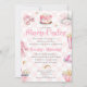 Um convite de festas de pijama de aniversário com ilustrações de pijama, sapatilhas, pipoca e bolo de aniversário com poema original. O plano de fundo é o padrão rosa da prancha de xadrez.