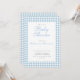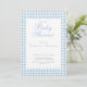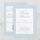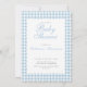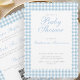 A cute and classy double sided invitation for a boy's baby shower featuring a dusty blue gingham with a scalloped edge. The back has a QR code and editable information about the party events and baby registry. Add the website link to the baby registry to edit the QR code. Perfect for an elegant baby shower to welcome your baby boy.
