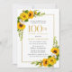 Cartão de aniversário de 100 anos, floral amarelo bonito. Peônias amarelas e margaridas brancas se misturam com os girassóis. Um quadro retangular de ouro lhe dá uma vibração elegante. Celebração de 100º Aniversário e nome do celebrante estão escritos em ouro. Muito fácil de personalizar. Essa parte de trás é branca com um buquê de girassol. Isto é perfeito para uma celebração de aniversário de verão.