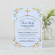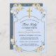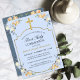 Celebre a Primeira Comunhão do seu filho com amigos e familiares convidando-os com este elegante e falso cartão de convite da Primeira Comunhão. Este design apresenta uma bela cruz ouro com uma trama de ouro contra um fundo azul macio com flores de aquarela com creme, pêssego e azul em cada canto. Personalize o texto e a fonte ao seu gosto. Outras fontes e estilos disponíveis.