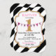 Impressão de faixa branca e preta preto com placa de banner de aniversário sobre uma letra numérica dourada e sotaque cor-de-rosa design de convite de aniversário moderno.