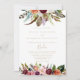 Este convite de casamento floral tropical de folha de ouro é perfeito para um casamento rústico. O design apresenta penas castanhas pintadas à mão, cor amarela-boho, branca, púrpura, rosa, pincel, flores borboletas e bagas azuis perfeitamente organizadas em belos buquês.