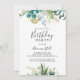 Este convite de aniversário floral tropical de ouro é perfeito para uma celebração de aniversário moderna. A design apresenta predominantemente folhagem verde-aquosa pintada manualmente, associada a flores douradas.
