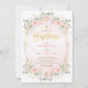 Ajude a celebrar o batismo da sua filha com este convite feminino. Apresentando uma elegante composição de camada de pincel adornada com flores cor-de-rosa pastel e verde-verde. Clique no botão "personalizar mais" se quiser reorganizar e formatar o estilo e a posição do texto. Vem com uma faixa cor-de-rosa e dourada correspondente na parte de trás.