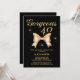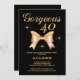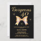 Um elegante convite de aniversário de 30 anos com uma fita de ouro fofa e a tipografia moderna "Gorgeous 40", em fundo preto.