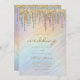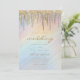 Este convite para casamento elegante e chic é perfeito para o seu dia especial. Ele retrata ouro impresso falso e gotas cintilantes prateadas em cima de um fundo holográfico e iridescente. O esquema de cores inclui pastas macios de azul, rosa, roxo, amarelo e verde. Este design é moderno, glamouroso, bonito, único e legal; o design perfeito para abraçar seus convidados.