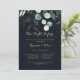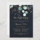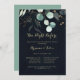 Esta noite azul floral de ouro antes do convite de janto de ensaio é perfeita para uma noite simples antes que a família do casamento e os amigos se jantem. Este design artístico apresenta folhagem verde de ouro, feita à mão, e cor d'água, eucalipto, em um fundo azul escuro, inspiradora beleza natural.