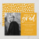 Convide convidados para comemorar o formando com nossos Cheers para os convites de festas de formatura de Formando. Os convites para a festa de formatura moderna apresentam a foto vertical do formando à esquerda. "Cheers to the formando" é exibido em um script de pincel branco, com letra manuscrita, com fundo amarelo de ouro. Personalize a frente do convite adicionando o nome do formando, o nome da escola, o ano de graduação e os detalhes da festa. O convite se inverte para exibir um padrão de abstrato branco e ouro amarelo.