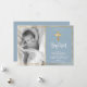 Simples Elegante Dourado batizante de batismo Azul e batismo Foto Convite. Enviar para a família e amigos com esta carta religiosa moderna personalizada. Ele apresenta um roteiro com letra de "Batismo", em torno de uma estrutura dupla falsa de folha de ouro sobre fundo azul leve e empoeirado.