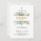 Esta imagem mostra um convite batismo maravilhosamente projetado. No topo do convite figura um símbolo simples e elegante, indicativo do significado cristão do evento. Abaixo da cruz encontra-se um arranjo de aquarela verde, com vários tons de folhas verdes que acrescentam um toque fresco e natural ao design. O texto é cuidadosamente exposto com uma mistura de fontes clássicas e modernas, enfatizando o convite para se juntar a uma cerimônia de batismo. O nome da criança é destacado, indicando a criança a ser batizada. Os dados do evento são claramente indicados, indicando a data, juntamente com a localização. Há uma nota de RSVP solicitando aos convidados que confirmem sua presença e um número de telefone é fornecido para esse fim.