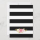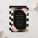 Palha elegante e convites florais de ouro com flores cor-de-rosa e marfim, cor-de-rosa-branco e verde-marrom, que delineiam os detalhes do casamento dentro uma moldura de ouro contra um fundo listrado preto e branco adornado com confete de ouro. Itens correspondentes disponíveis.