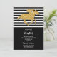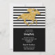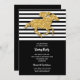 Os convites de festas do dia Derby apresentam um falso cavalo de corrida dourado e jóquei em listras brancas e pretas na parte superior e preta na parte inferior para sua festa em letra chic. CORRESPONDENTE a itens na nossa coleção.