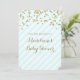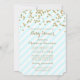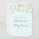 Convites personalizados para chuveiros de bebês com padrão de configuração dourado e listras brancas e azuis claras, com letras escritas à mão. Personalizável com o seu texto.