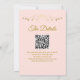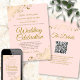 Este belo convite de casamento é na moda, simples e elegante. Ele apresenta letras douradas em um fundo cor-de-rosa pincelado pálido com filtro de folha de papel floral em cada canto. A design subestimada é compensada pelas ampolas e espirais do trabalho de arte. A parte traseira tem um código QR personalizável e uma nota de detalhes para que você possa direcionar seus convidados para um site para informações e RSVP.