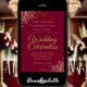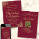 Este belo convite de casamento é na moda, simples e elegante. Ele apresenta uma inscrição dourada em um fundo cor de borboleta, marrom ou vinho tinto com um filtro floral de folha falsa em cada canto. A design subestimada é compensada pelas ampolas e espirais do trabalho de arte. A parte traseira tem um código QR personalizável e uma nota de detalhes para que você possa direcionar seus convidados para um site para informações e RSVP.