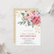 O convite para o aniversário floral Elegante e na moda apresenta uma impressionante cor d'água vermelha e flor rosa de pedras com folha de ouro verde-verde. Você pode personalizar facilmente os detalhes da festa, incluindo a idade, para torná-la ainda mais personalizada. Compartilhe a alegria com os seus amigos e família e faça deste aniversário milestone para se lembrar!