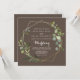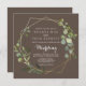 Este convite de casamento, verde-marrom e verde de ouro geométrico é perfeito para um casamento de boho. A design apresenta lindas folhas verdes pintadas manualmente em um fundo azul escuro, enfeitando uma armação geométrica dourada. Salve o papel, incluindo mais detalhes na parte traseira do convite em vez de em uma placa de gabinete separada.